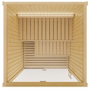 High-quality dimmable LED lighting is dotless for a more elegant appearance and indirectly illuminates the sauna interior from behind the backrests. The lighting is controlled by a portable remote control.