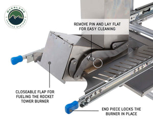 Superior Functionality: The Overland Vehicle Systems Komodo Camp Kitchen is the perfect cooking station for your next outdoor adventure. This expandable camp kitchen is designed to take up little space when stored but quickly expands into a large cooking area with plenty of room for prepping and cooking. The dual propane grills and skillet let you cook up a variety of meals, while the Rocket Tower burner adds an additional option to cook. The Rocket Tower allows for wood chips and briquettes to be a heating solution - perfect for those who want to add more cooking area or if propane is not available to use. And when it's time to clean up, all the parts easily fold up and fit back inside for easy transport. Cooking with the dual grills allows for efficient cooking and they can be slid underneath the skillet for increase cooking performance. In the event propane is not available, the Rocket Tower will allow you to continue cooking with wood or briquettes.